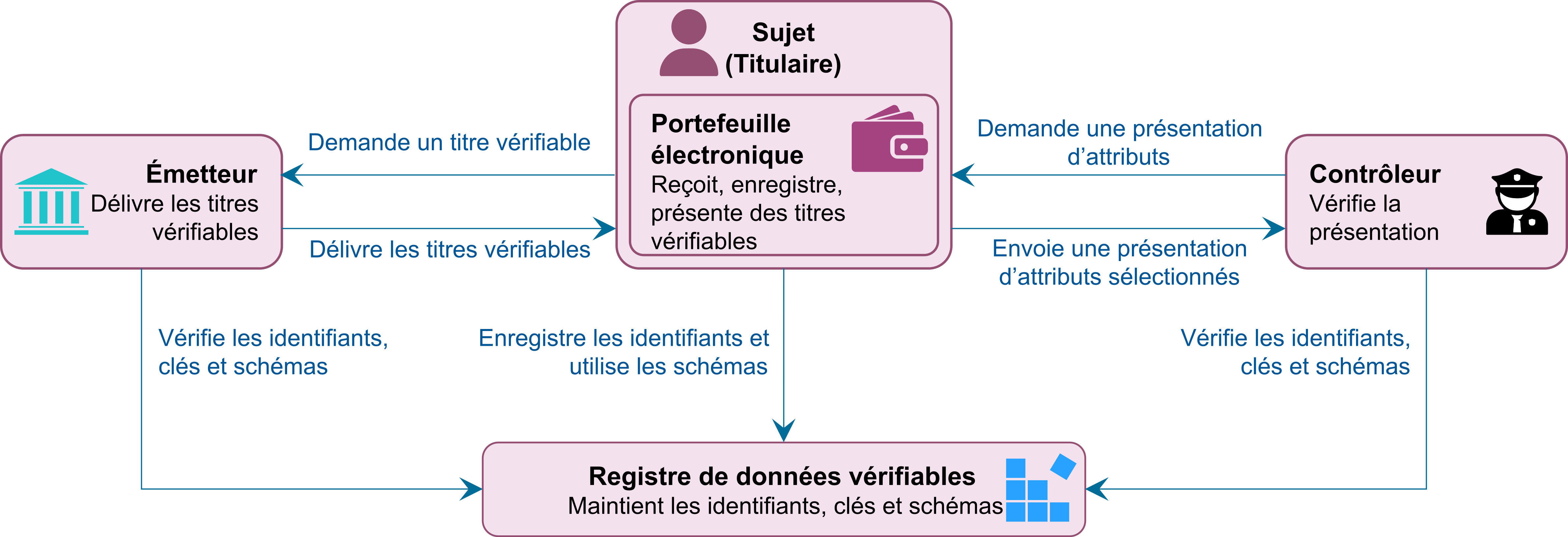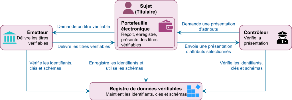 Les principaux acteurs intervenant dans une architecture de titres vérifiables sont présentés dans la Figure 1 et incluent :