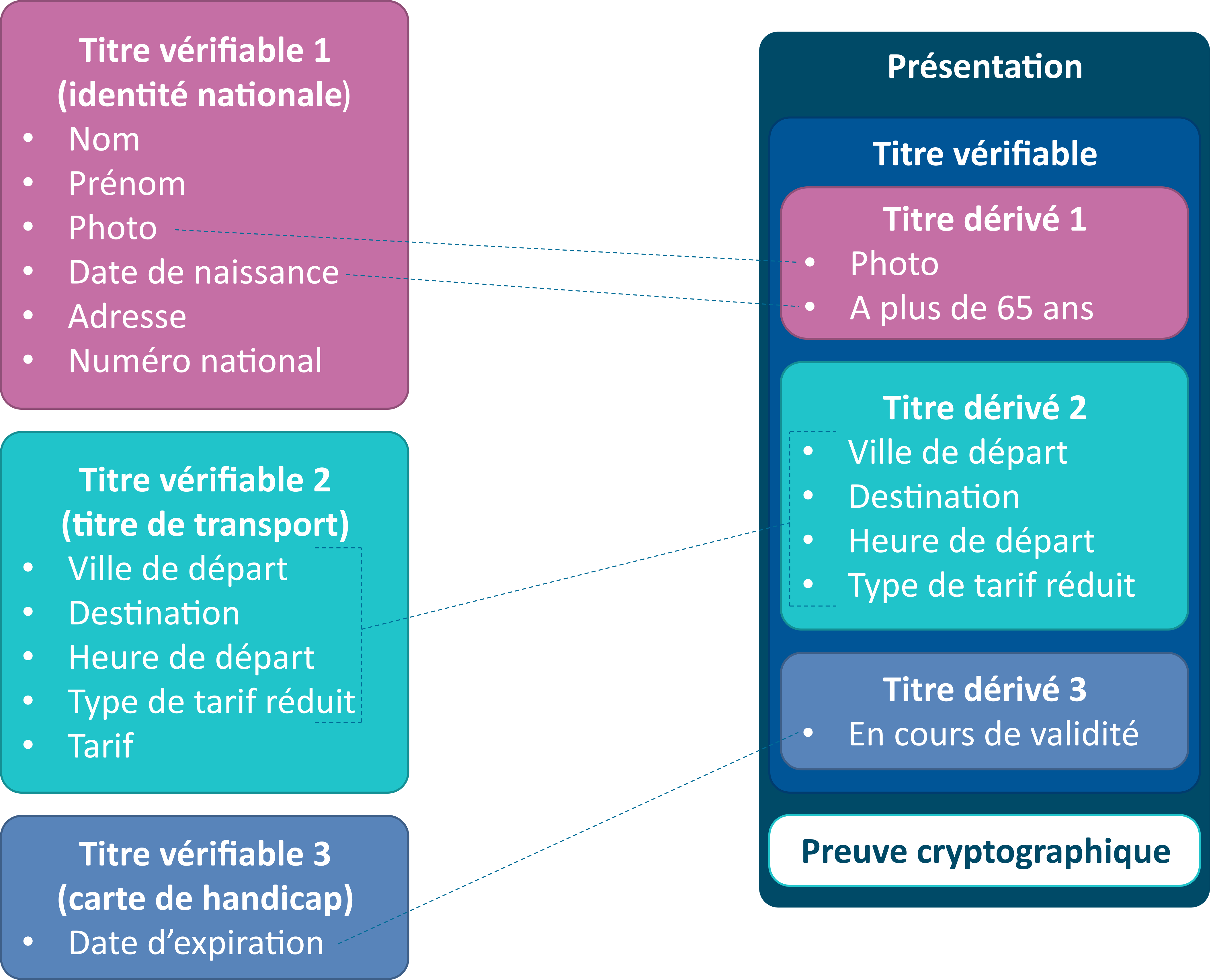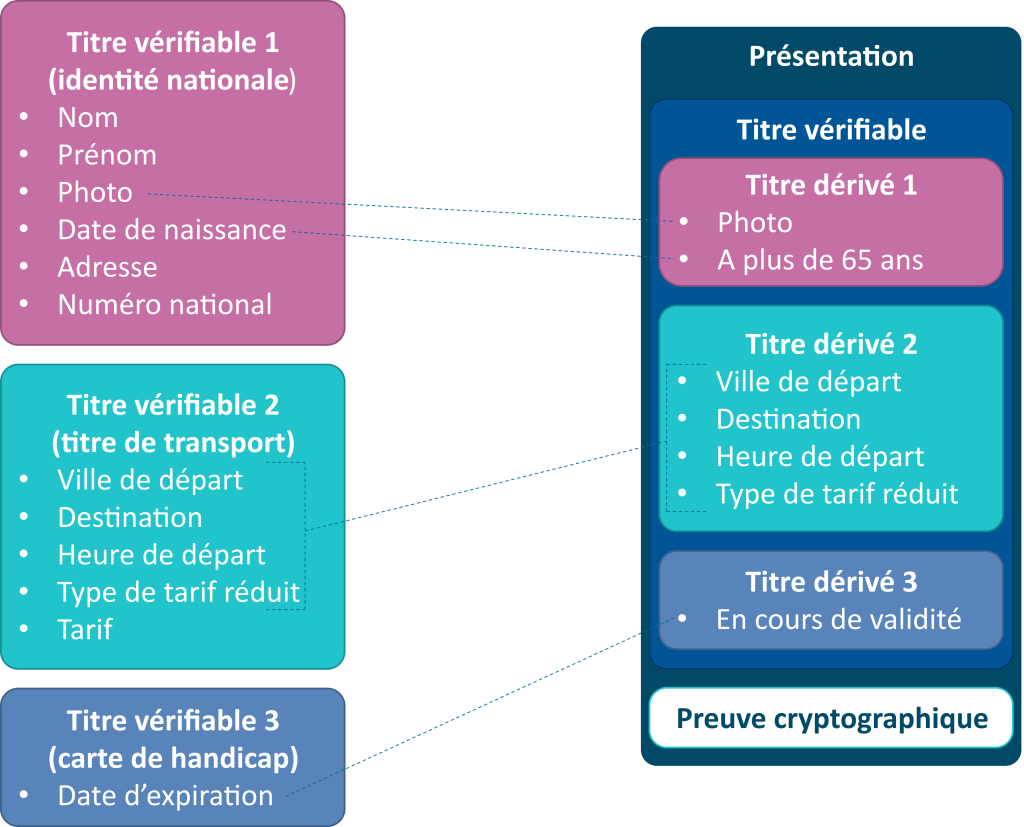 Les informations d’identification basées sur des titres anonymes peuvent exprimer n’importe quelle information contenue dans un justificatif d’identité physique en offrant un avantage supplémentaire : ils peuvent être combinés (voir Figure 2), et ils permettent de ne révéler que les attributs requis (divulgation sélective) voire même des informations dérivées de ces attributs. Un exemple emblématique est la date de naissance : il est possible de ne révéler que l’âge, que la catégorie d’âge (p. ex. 50-60 ans), ou encore simplement le fait que la personne a plus ou moins d’un certain âge, etc. sans pour autant révéler la date de naissance exacte.