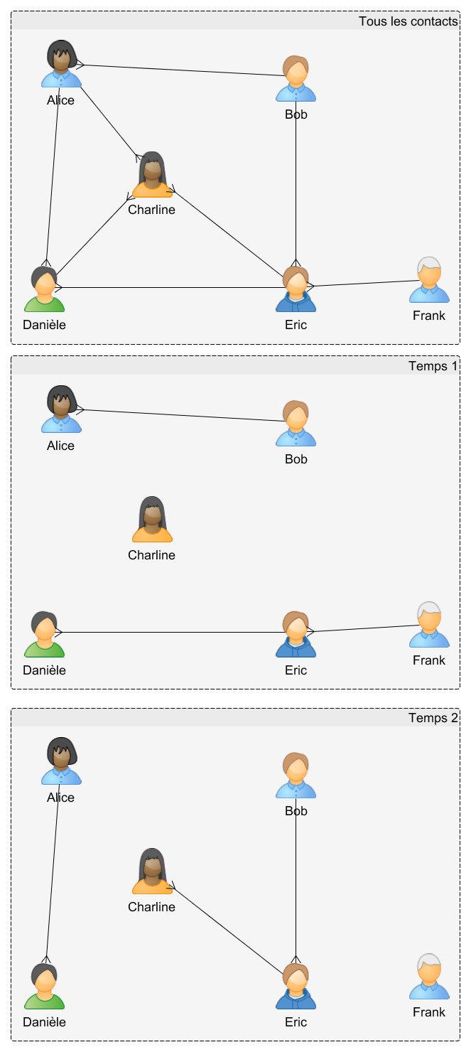 Mais si l’on observe ce réseau comme un film, en ne considérant que les contacts ayant eu lieu sur une fenêtre de temps relativement courte, on pourrait apercevoir que, chaque fois que Danièle contacte Éric, celui-ci contacte Frank dans la foulée (temps 1), et que dans les minutes qui suivent chaque appel de Charline à Éric, ce dernier appelle systématiquement Bob (temps 2).