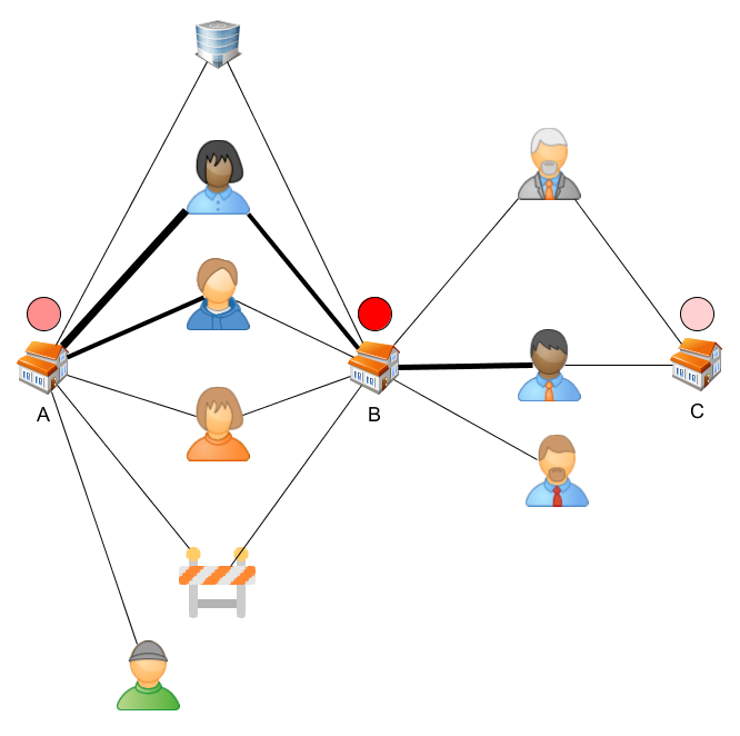 Dans l’exemple ci-contre, une fraude a été mise au jour au sein de la société B, au centre (macaron rouge). On va dès lors examiner toutes les entreprises “voisines”, c’est-à-dire ayant partagé des employés (pas nécessairement simultanément), travaillé sur des chantiers communs (s’il s’agit d’entreprises de construction), ou utilisant des mêmes fournisseurs ou sous-traitants. Une relation ayant duré plus longtemps sera considérée comme plus “forte” (lignes plus épaisses dans le schéma ci-contre).