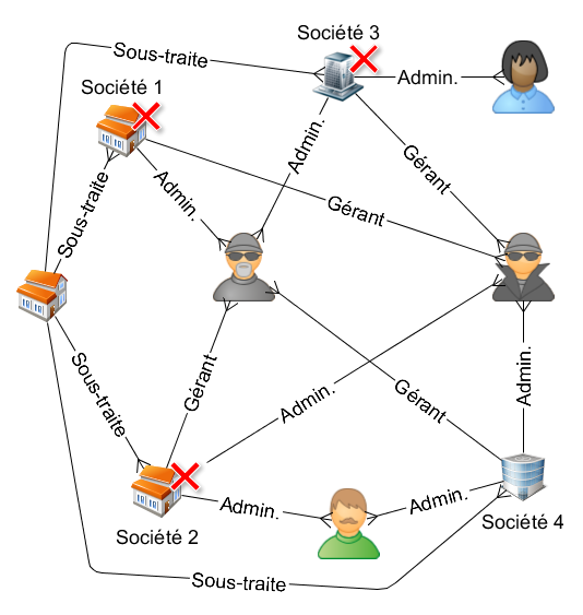 La figure ci-contre illustre un exemple, dans lequel trois sociétés (1, 2, 3, marquées par une croix rouge) ont déjà fait faillite, et par lesquelles les deux individus du milieu sont passés. Par ailleurs, une société a été sous-traitante pour les trois sociétés en question. La société 4 mérite toute l’attention des inspecteurs : elle partage à la fois les deux personnes “suspectes”, ainsi que le sous-traitant potentiellement complice.