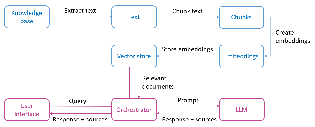 Les applications basées sur l’architecture ci-dessus peuvent être rapidement développées grâce à des frameworks comme Langchain. Ils offrent généralement des abstractions permettant d’exécuter en quelques lignes de code les tâches décrites dans le schéma ci-dessus (extraire le texte, le diviser, créer et sauvegarder les embeddings). Ils agissent également comme une sorte d’orchestrateur pour relier l’input de l’utilisateur à la base de données vectorielles et au modèle de langue.
