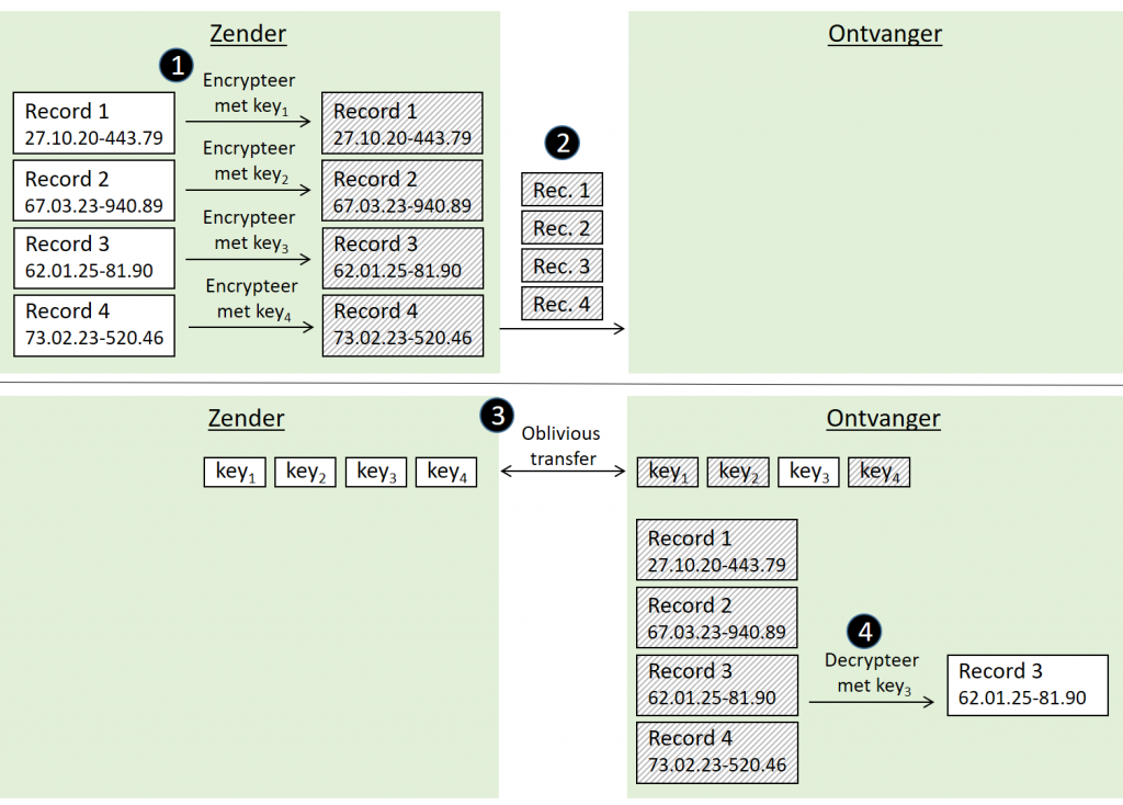 (alsook eventueel latere updates) worden vervolgens naar de ontvanger gestuurd (stap 2). De ontvanger beschikt zo over een volledige, weliswaar vercijferde, kopie van de gegevensset. Om toegang te krijgen tot een specifiek record wordt het oblivious transfer protocol uitgevoerd, niet zoals daarnet op de records zelf, maar op de bijhorende symmetrische sleutels (stap 3). Eén zo’n sleutel is (typisch) slechts 32 bytes groot, wat maar een fractie is van de grootte van de records zelf. Daardoor wordt het mogelijk een setgrootte van 11 350 000 te nemen bij het uitvoeren van het oblivious transfer protocol. De ontvanger krijgt zo toegang tot één van de 11 350 000 sleutels, waarmee vervolgens exact één record gedecrypteerd kan worden (stap 4). Bij een dergelijke uitvoering van het oblivious transfer protocol wordt zo’n 363MB, voornamelijk vercijferde sleutels, doorgestuurd, moet de zender een kleine 80 seconden rekenen, en de ontvanger 0,24 seconden (met onze eerder vermelde Lenovo L570).