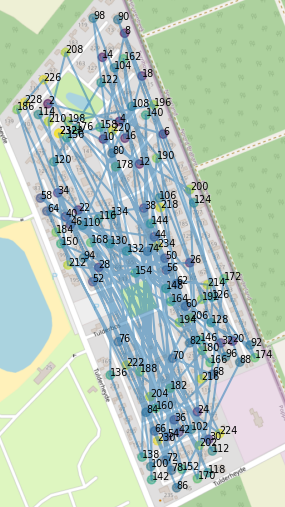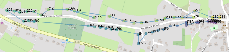 De rue François Michoel in Jalhay heeft bijvoorbeeld alleen even nummers, met oplopende nummers aan de ene kant en aflopende nummers aan de andere kant (zie bovenstaande figuur, waar de blauwe lijn de nummers in oplopende volgorde volgt. Gebaseerd op gegevens van Best Address, met OpenStreetMap als achtergrondkaart). Deze lay-out is ook te vinden in bepaalde afgesloten gebieden, zoals de drève de Trévires in Waver of de Henri Wautierlaan in Saintes.