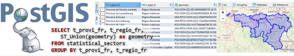 Nous y verrons les concepts de jointure spatiale (jointure de tables sur base d’informations géographiques), d’agrégation, d’indexation ou encore de chargement de données. Ces concepts, très puissants, sont fondamentaux pour la manipulation de données géographiques.